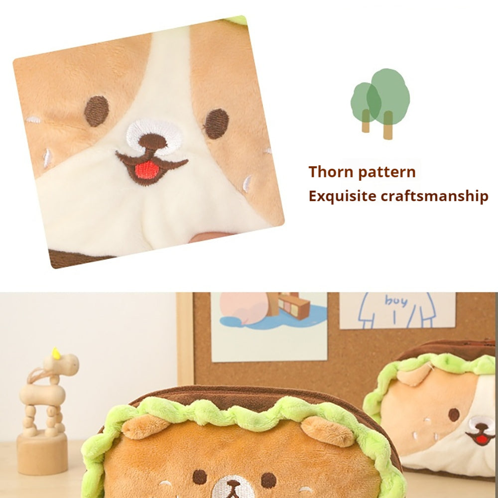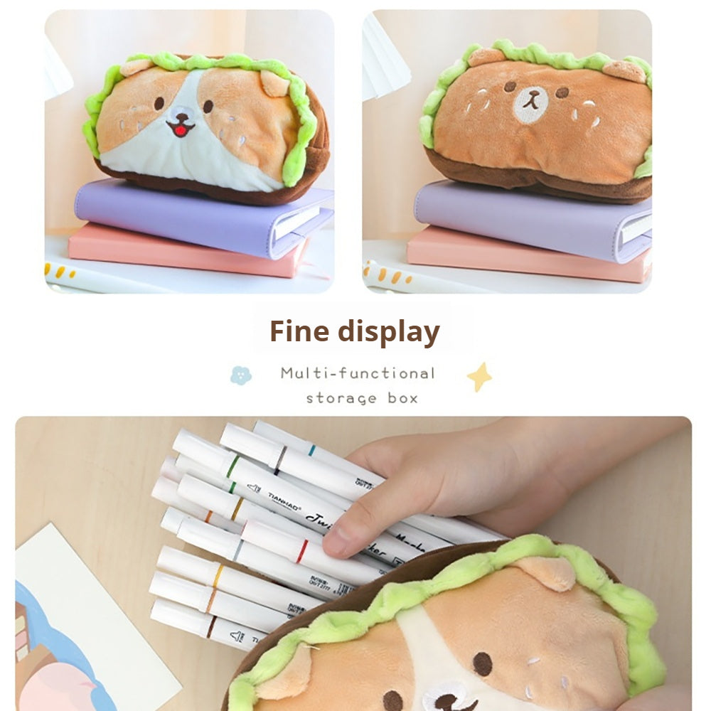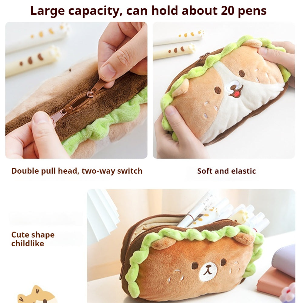 Cute hamburger pencil case, cute, full of fun, embroidery, large capacity, double zipper pullers, soft short plush, healing bear, puppy, burger, fat pencil case