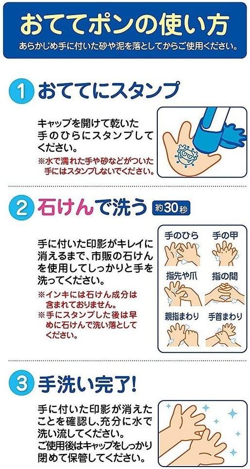 Easy to use! (Apply the stamp to your dry palm and wash your hands thoroughly with commercially available soap until the imprint disappears.